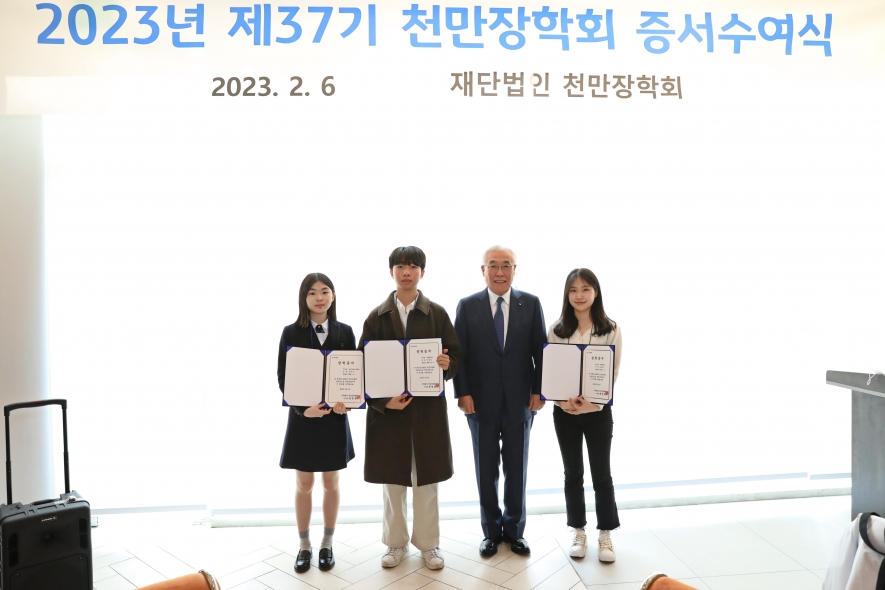 천만장학회는 6일 ‘제37기 장학증서 수여식’을 개최하였습니다. 이날 수여식에서 천만장학회는 고등학생 30명, 대학생 70명 등 총 100명에게 장학증서를 전달했으며, 올해 총 6억원의 장학금을 지급할 예정입니다.