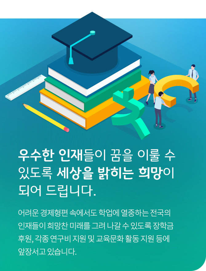 희망찬 미래를 그려 나갈 수 있도록 장학금 후원, 각종 연구비 지원 및 교육문화 활동 지원 등에 앞장서고 있습니다.